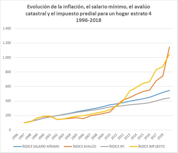 La imagen anterior muestra la evolución del avalúo catastral y el impuesto predial para el hogar de mis padres. También presenta la evolución de la inflación y del salario mínimo. Los datos se muestran a través de índices, que reflejan el crecimiento porcentual anual de cada rubro. Como se puede observar, el valor del impuesto predial evoluciona de la mano del valor del avalúo catastral. Mientras tanto, las evoluciones de la inflación y del salario mínimo están completamente desligadas del impuesto y muy por debajo de su crecimiento. Así las cosas, en el periodo 1996-2018 el impuesto predial se multiplico más de 10 veces, mientras que el salario mínimo apenas lo hizo 5 veces. Impuesto confiscatorio.