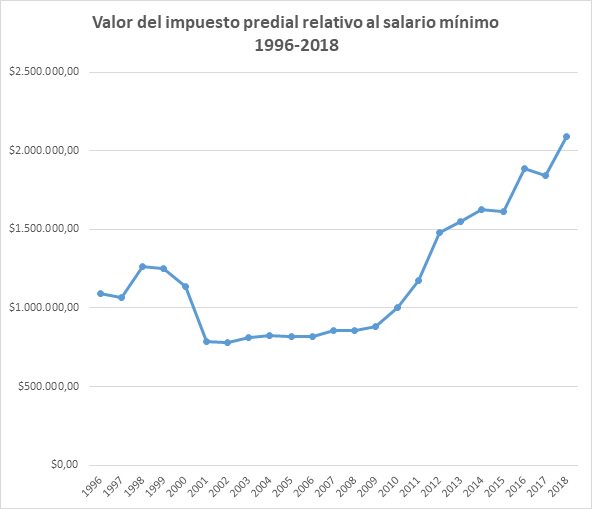 La gráfica anterior muestra una forma distinta de ver el problema. En relación con el salario mínimo, el impuesto predial se dobló entre 1996 y 2018, lo cual quiere decir que este hogar tendrá que destinar este año el doble de ingresos que destinaba en 1996 para el pago del predial. Y eso suponiendo que los ingresos del hogar crecen con el aumento del mínimo, que no es el caso de la mayoría de hogares bogotanos.
